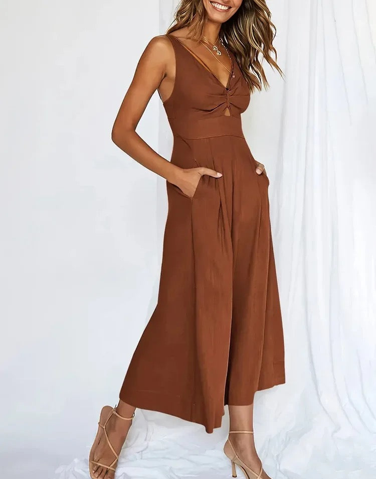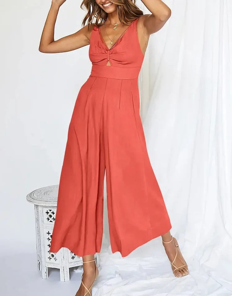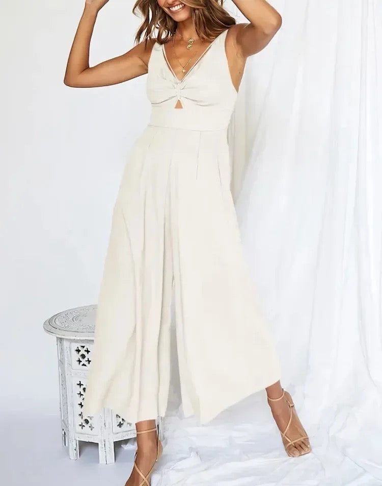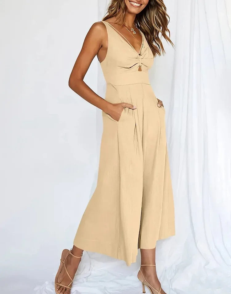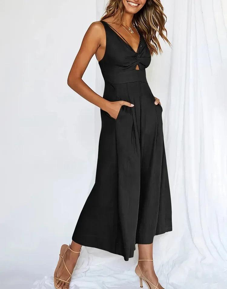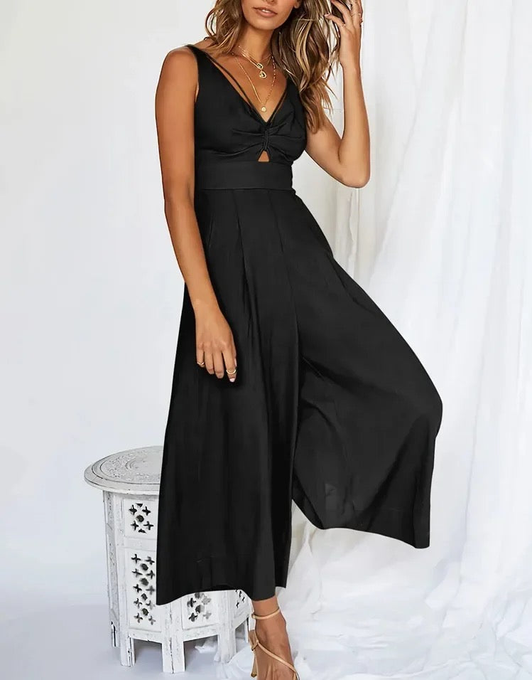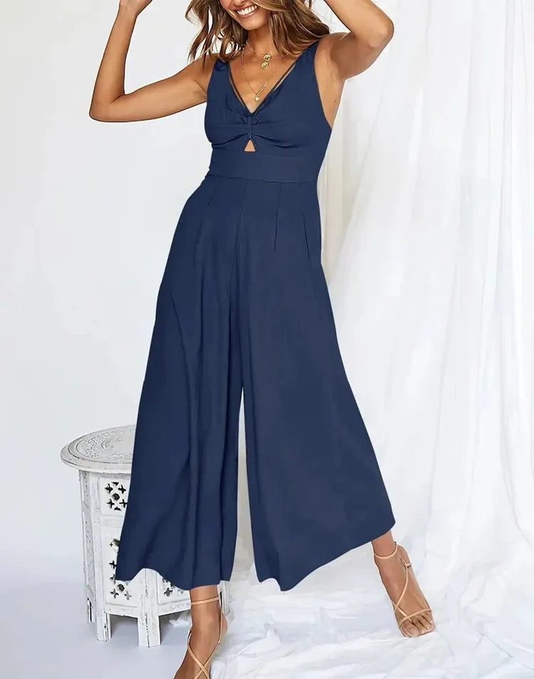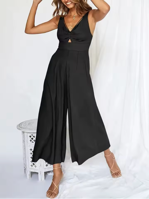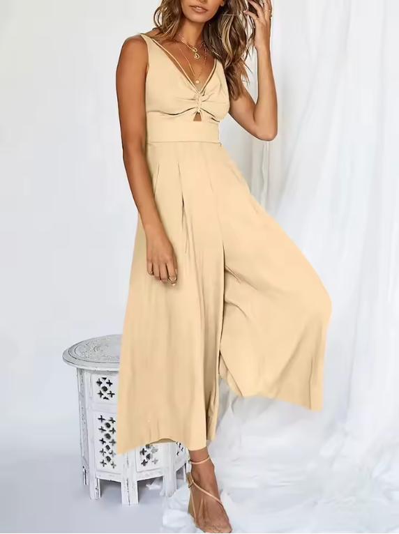 Il completo Chloé™ valorizza la femminilità con scollo a V annodato, vita segnata e gamba fluida: leggerezza e stile in perfetto equilibrio.